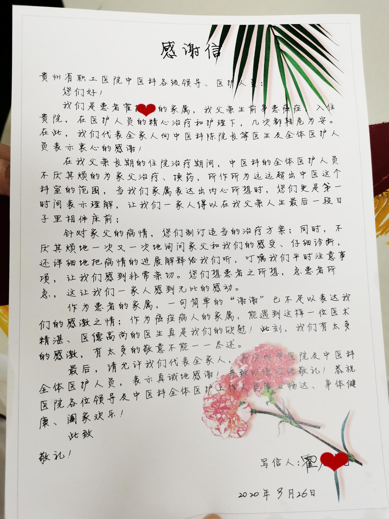 就在前几天,一位癌症患者霍先生度过生命最后的时光,离开了他至亲至爱的家人。刚刚料理完父亲的后事,霍先生的儿子便和家人一起带着父亲的遗愿来到贵州省职工医院中医科,将一面锦旗和一封感谢信交到医护人员手中。