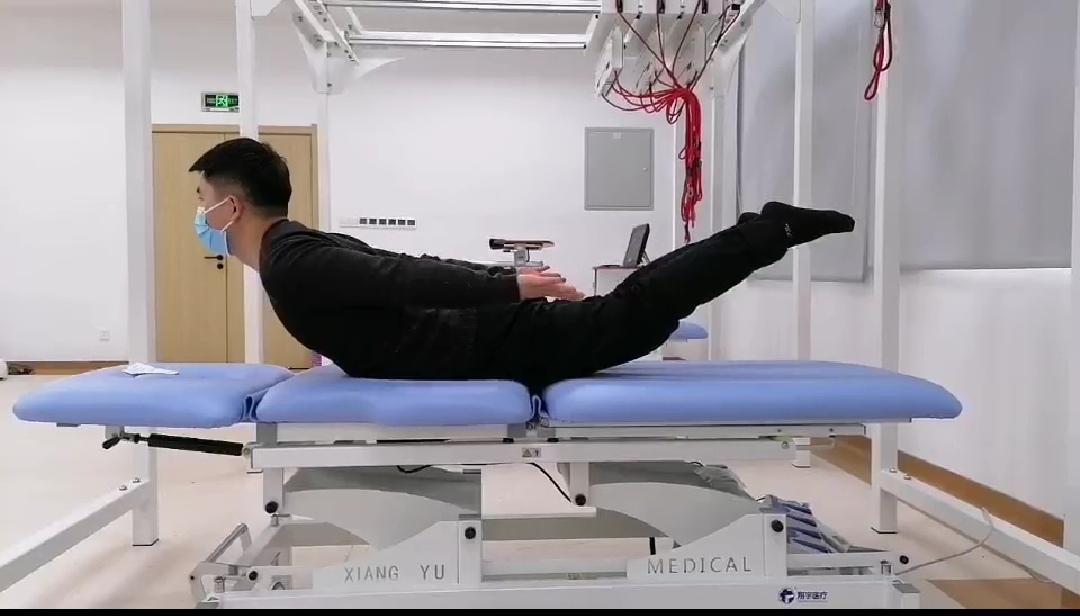 a、俯卧位,双臂向后伸起,双腿向上翘起,用力至最高点保持5-10秒停留。