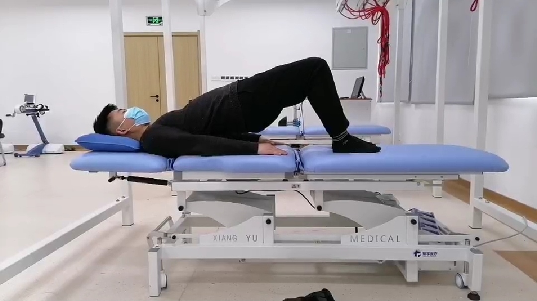 a、仰卧位,以足和背部作支点,抬起臀部使身体呈一条直线,并停留10秒,再慢慢落下。