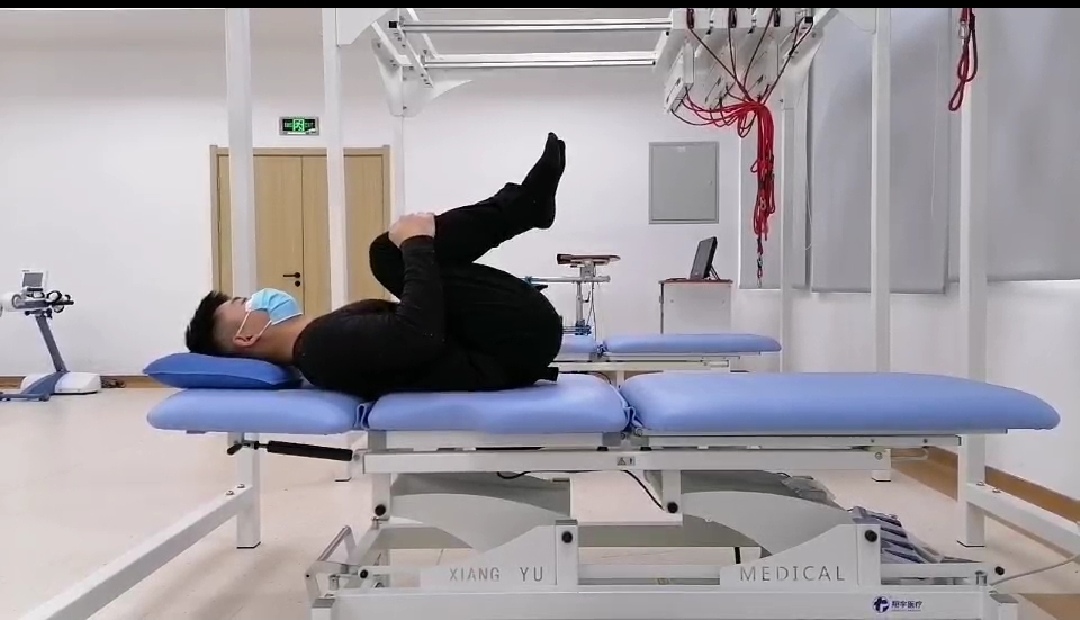 b、在疼痛可以忍受的前提下轻柔而缓慢地将两膝尽量靠近胸部。