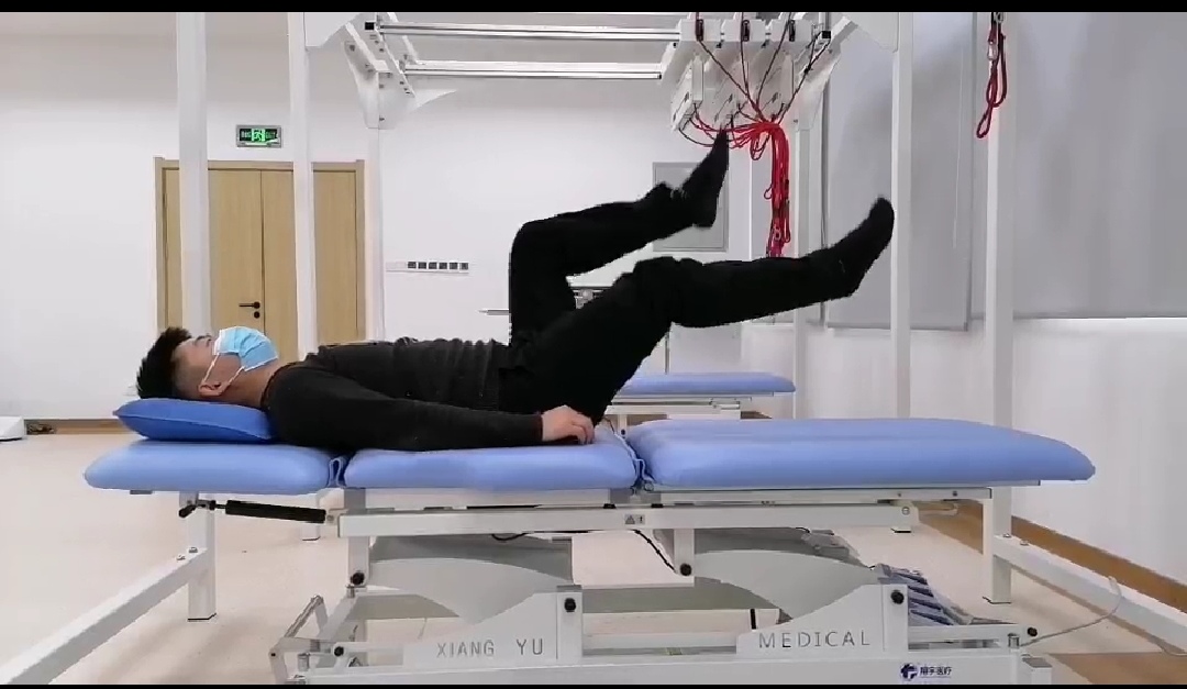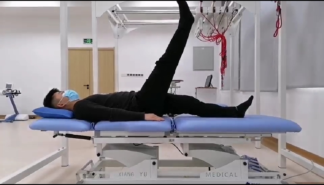 平卧位,一侧膝关节完全伸直后抬高,坚持6秒钟以上,放松恢复原位,双腿交替进行。