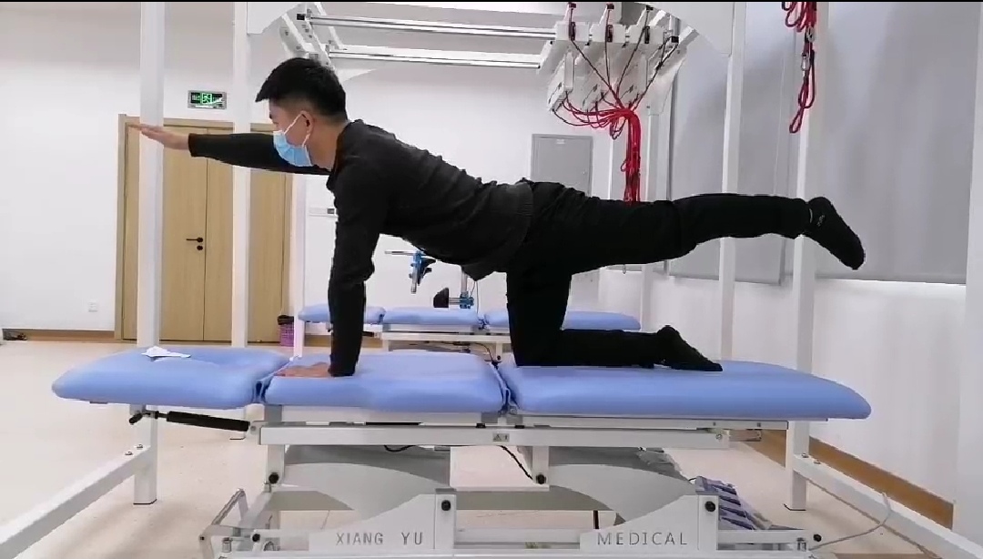 a、俯卧位双膝双手支撑,同时伸直一侧上肢和对侧下肢,并保持10秒。