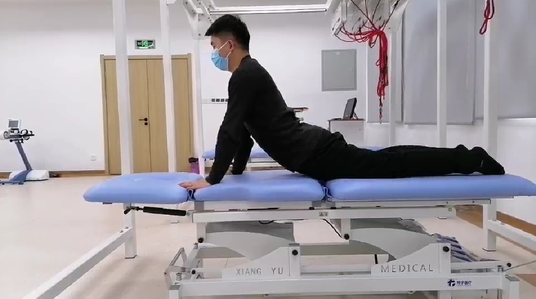 a、继续保持俯卧的姿势,摆出准备做俯卧撑的姿势。伸直手臂,在疼痛可以忍受的前提下尽量撑起上半身。