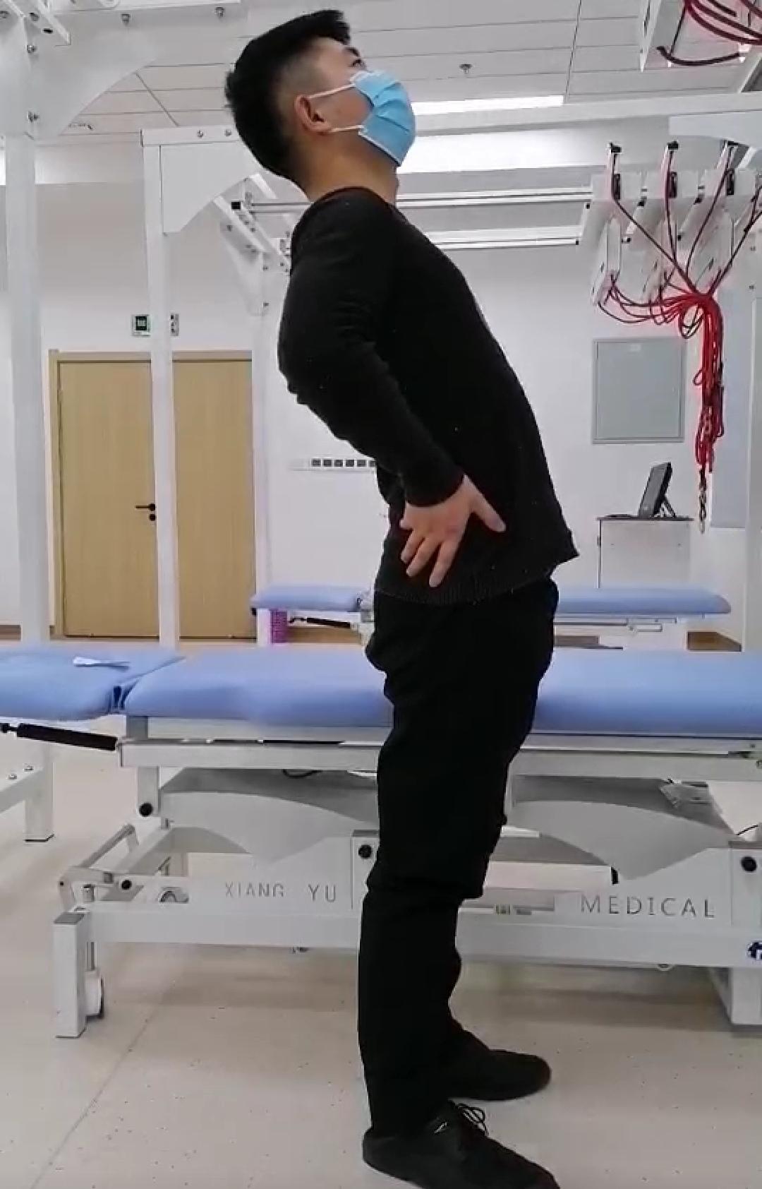 a、两脚分开站直,双手放在后腰部,四指靠在脊椎两侧。